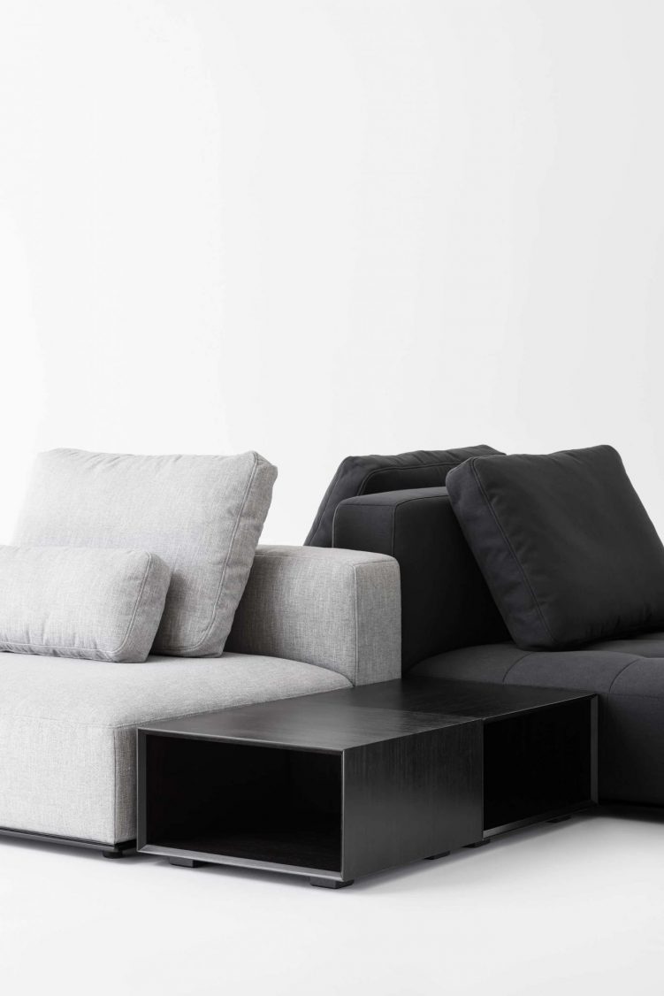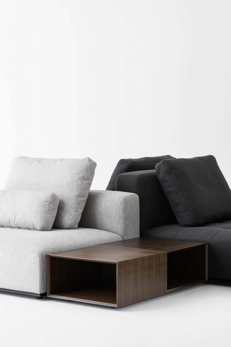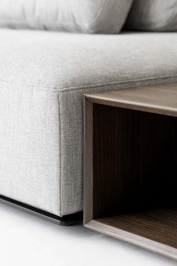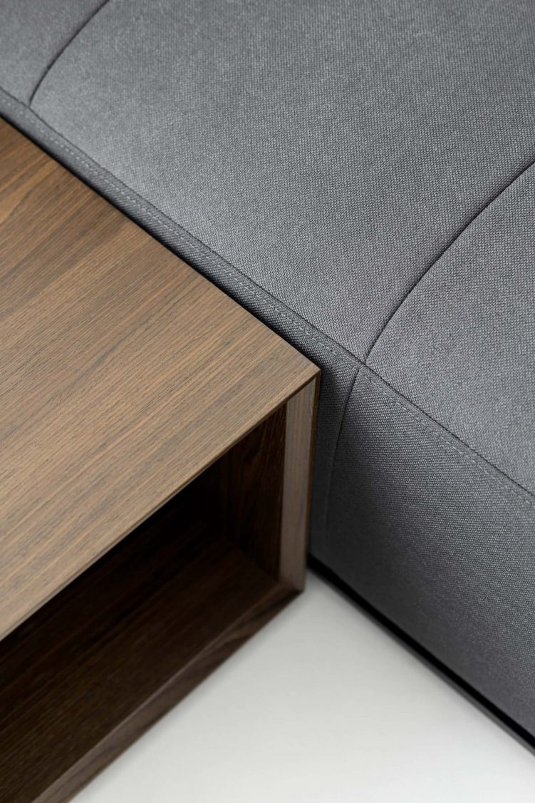 The coffee table of the modular sofa ESTRO is made of MDF veneered with natural wood