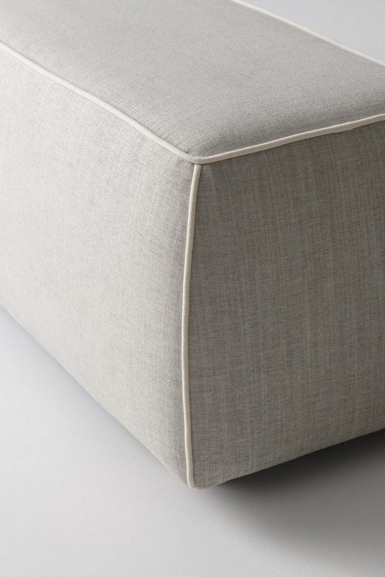 Ławka LIMURA — stylowy dodatek do łóżka z tej samej kolekcji, podkreślający spójność wystroju sypialni. Dekoracyjna lamówka podkreśla miękkie, zaokrąglone kształty i dodaje elegancji. Niskie drewniane podpory doskonale komponują się z fakturowaną tapicerką i tworzą wrażenie przytulności i kompletności.